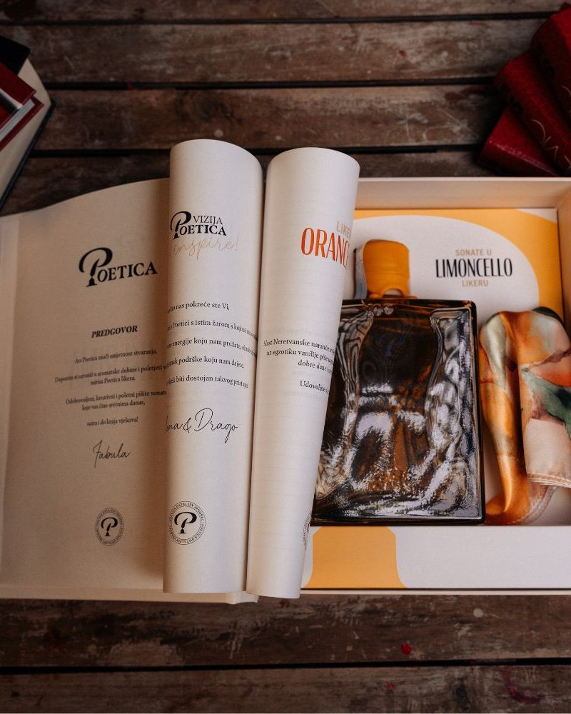 Idealan poklon u kojem su Limoncello Liker 0,7 l i svilena marama koju je oslikala Vrgorska umjetnica Maya Beus. Marama je oslikana motivima voća i trava koje Poetica koristi u proizvodnji svojih likera. Pakiranje je dizajnirano kao poklon knjiga.