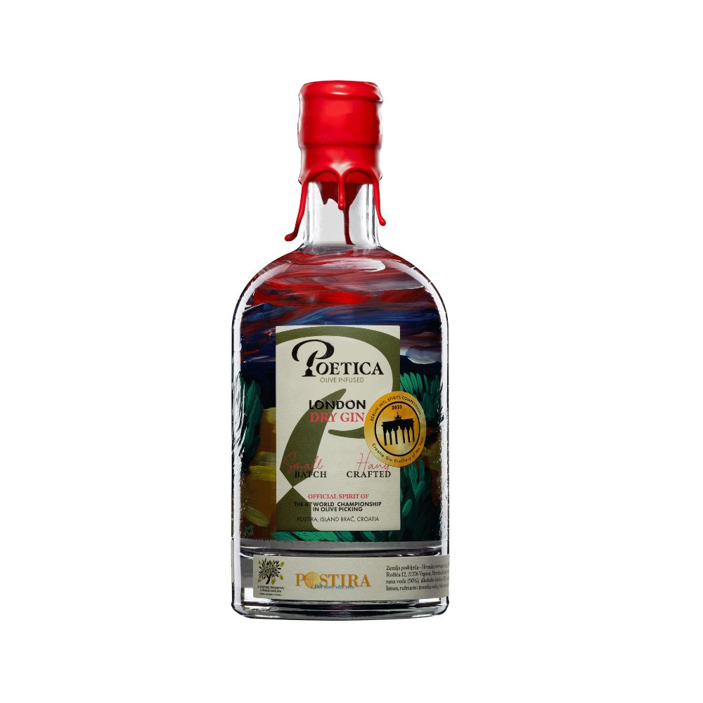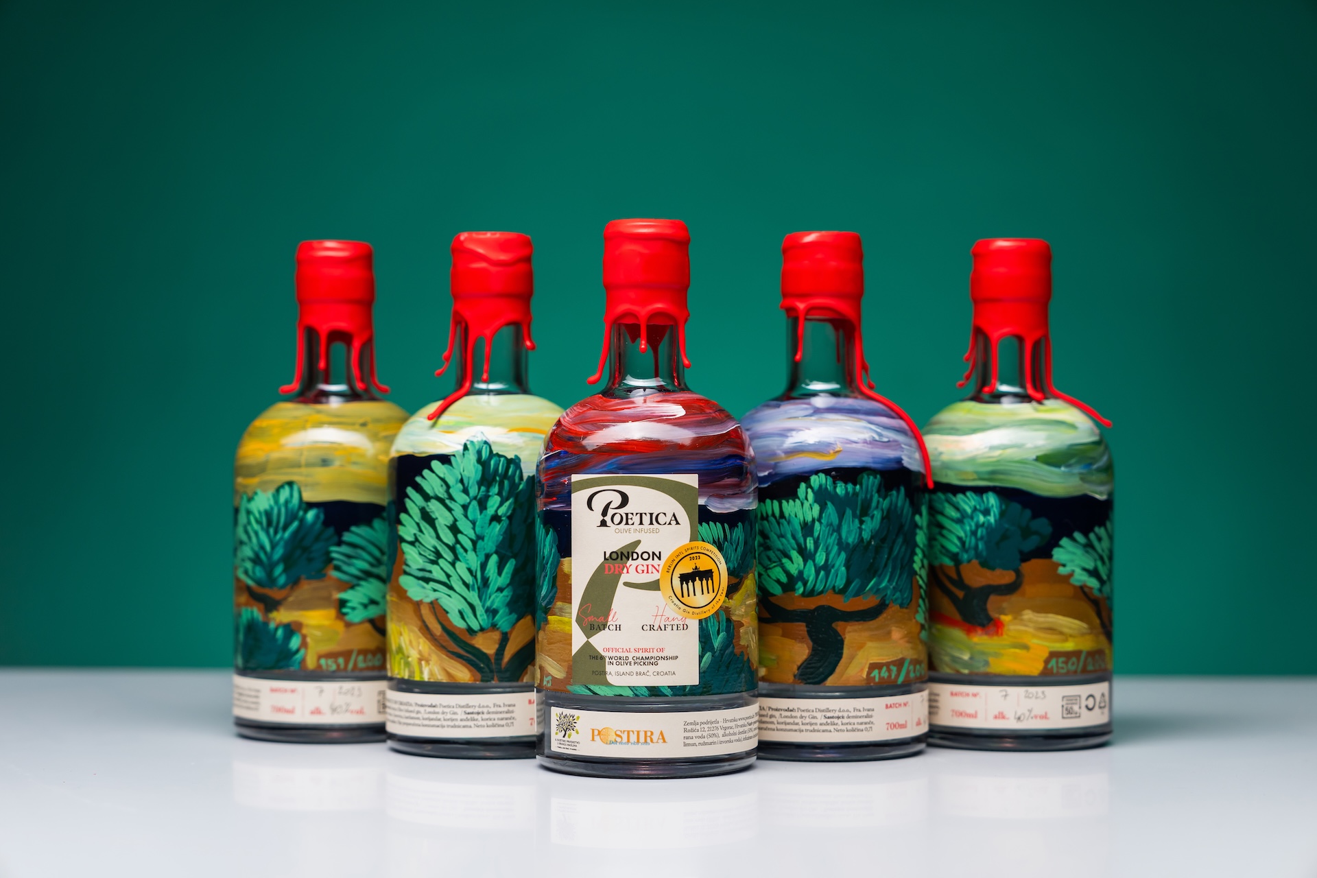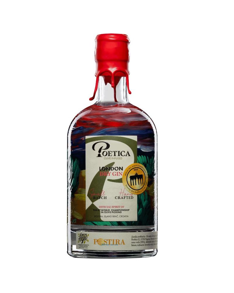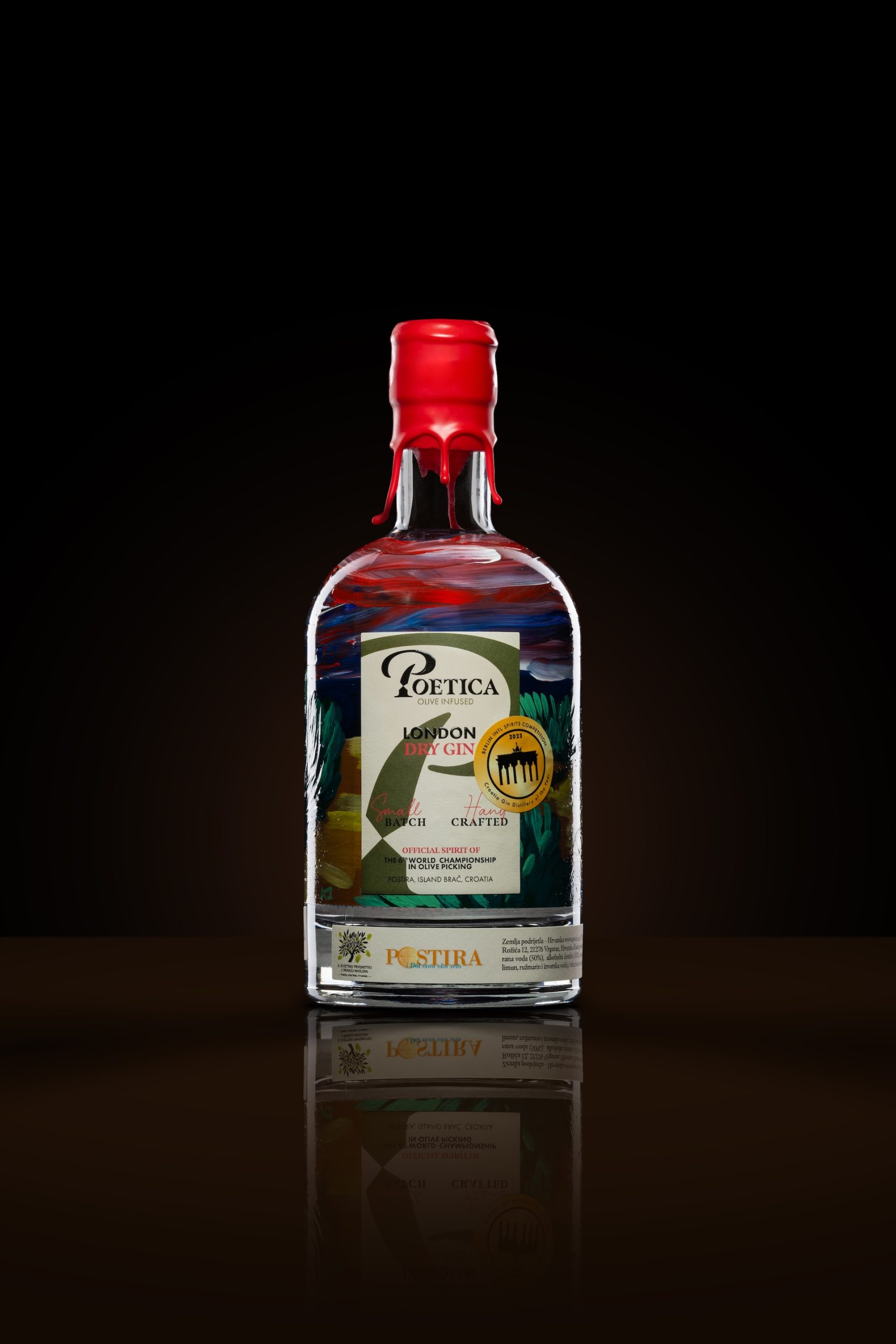 Poetica Olive gin je konceptni gin koji je napravljen kao službeni spirit Svjetskog prvenstva u branju maslina koje se svake godine održava u Postirama na otoku Braču. U vrijeme rezidbe masline Oblice, koja je simbol otoka, destiliramo listove i njima oplemenjujemo našu originalnu recepturu. Završni osjećaj mladog maslinovog ulja, kako u okusu tako i u teksturi predstavlja jedinstveno iskustvo u ispijanju gina. Posebnost ove boce je i da je svaka ručno oslikana motivom maslinika u različitim interpretacijama mladog Vrgorskog akademskog slikara Ante Tolića. Dakle svaka boca je i umjetničko djelo.